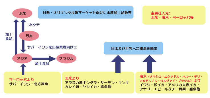 ● 南米(メキシコ、エクアドル、ペルー、チリ、アルゼンチン、ウルグアイ、ブラジル)から日本及び世界へ冷凍魚輸出
